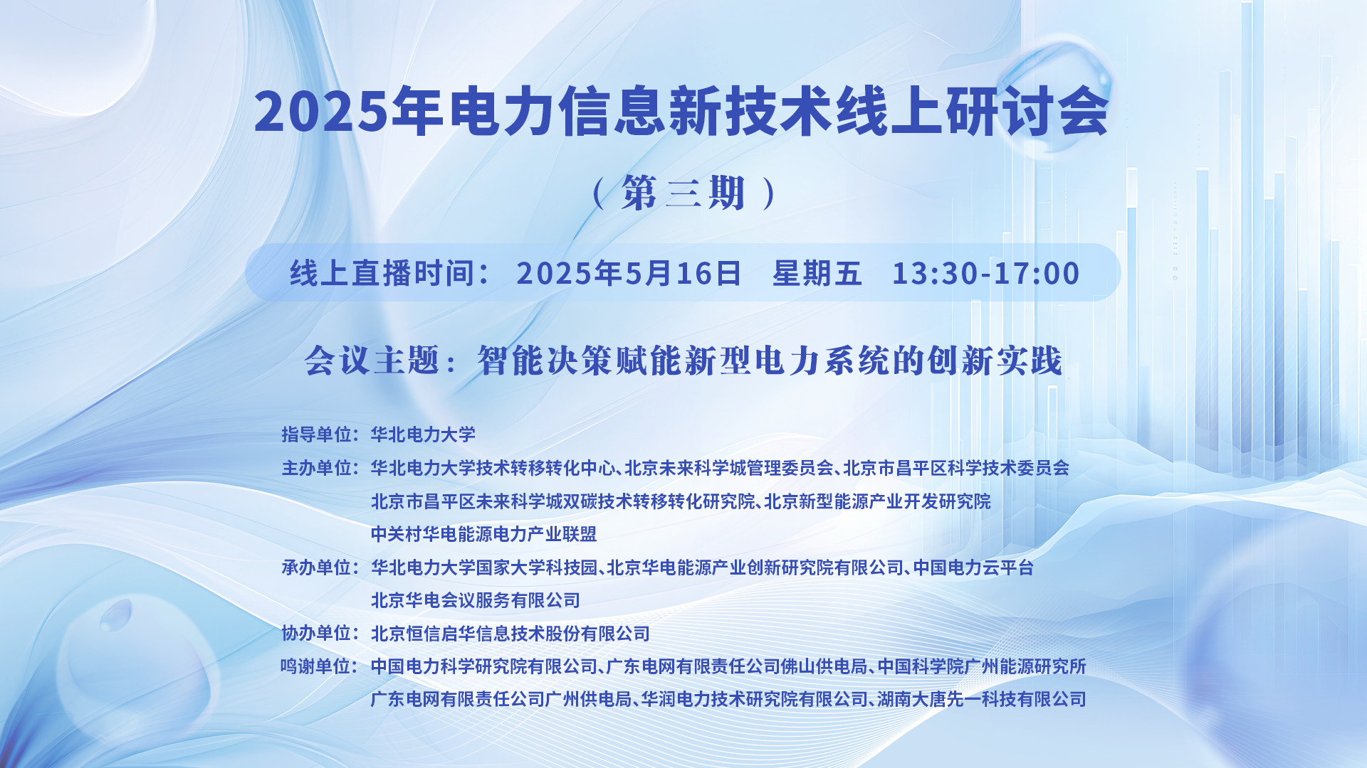 2025年電力信息新技術(shù)線(xiàn)上研討會(huì)(第三期)一、講座主題:智能決策賦能新型電力系統(tǒng)的創(chuàng)新實(shí)踐 二、講座時(shí)間:2025年5月16日 星期五 13:30-17:00 三、講座地點(diǎn):線(xiàn)上直播:https://t19c5.xetlk.com/sl/1KZA7r(聯(lián)系人李老師 18911662193) 四、主講人信息: (一)主講人:李亞平 ...主講人:李亞平、齊丹、邱桂華、王同賀、孔令明、彭喆、馬桂英時(shí)間:2025-05-16 13:30地點(diǎn):線(xiàn)上講座 -